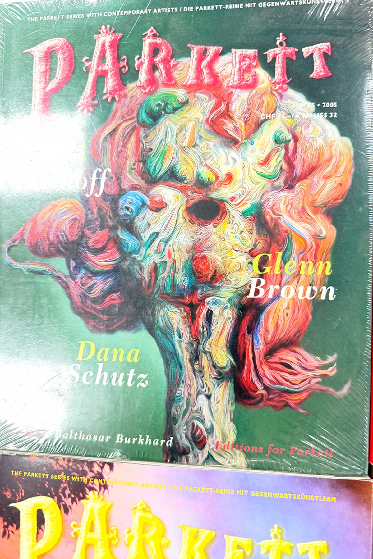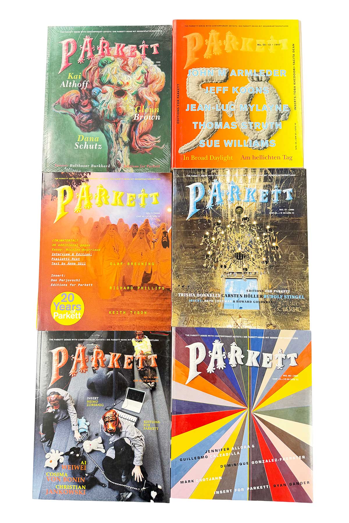 A set of six vintage Parkett magazines featuring Dana Schutz, Ai Weiwei, Jeff Koons, and additional leading voices in contemporary art.