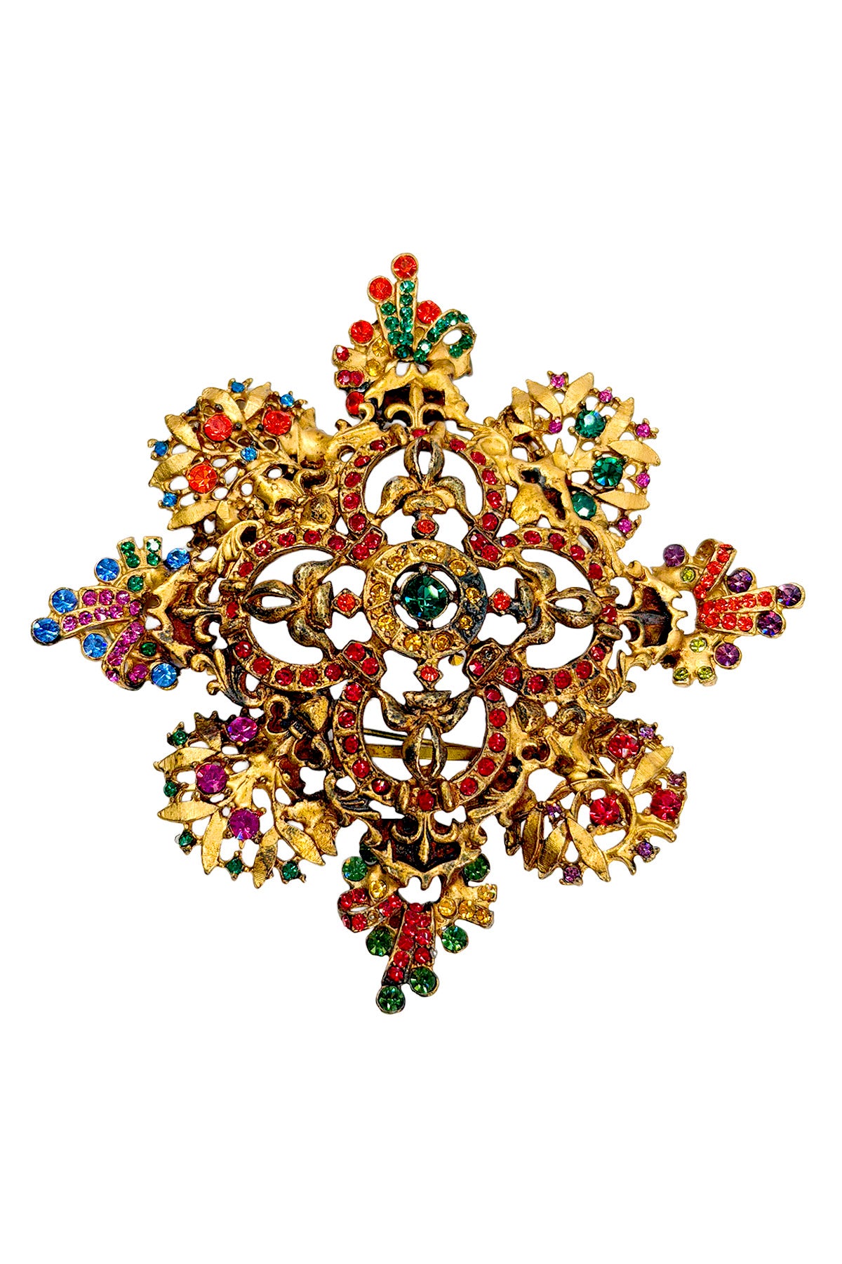 Created using vintage jewelry molds from the 1950s discovered at a flea market, originally purchased without knowing their purpose. The forms were later cast and reconstructed into entirely new shapes, resulting in this richly layered crest composition.