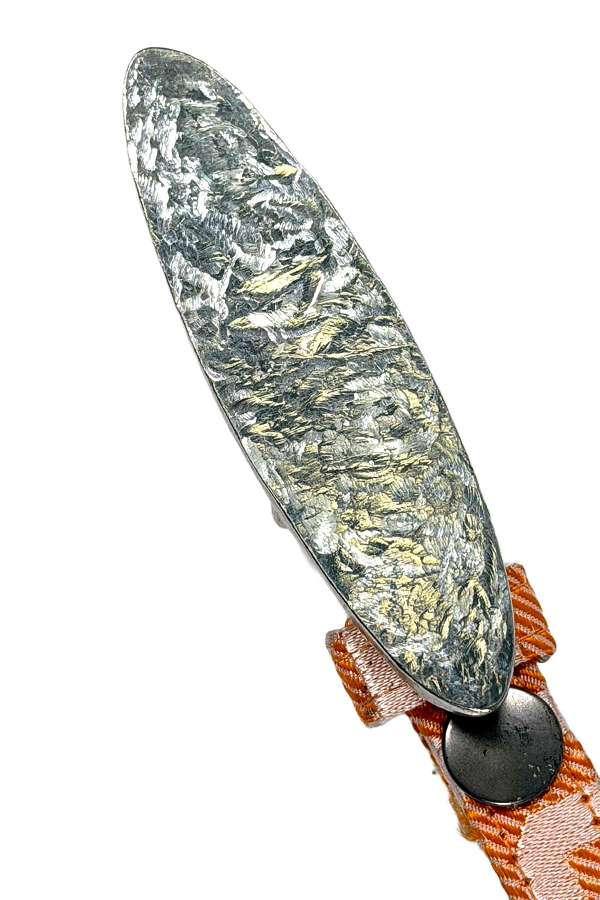 A vivid, finely scaled belt crafted in tangerine silk brocade, woven with tonal geometric patterning.