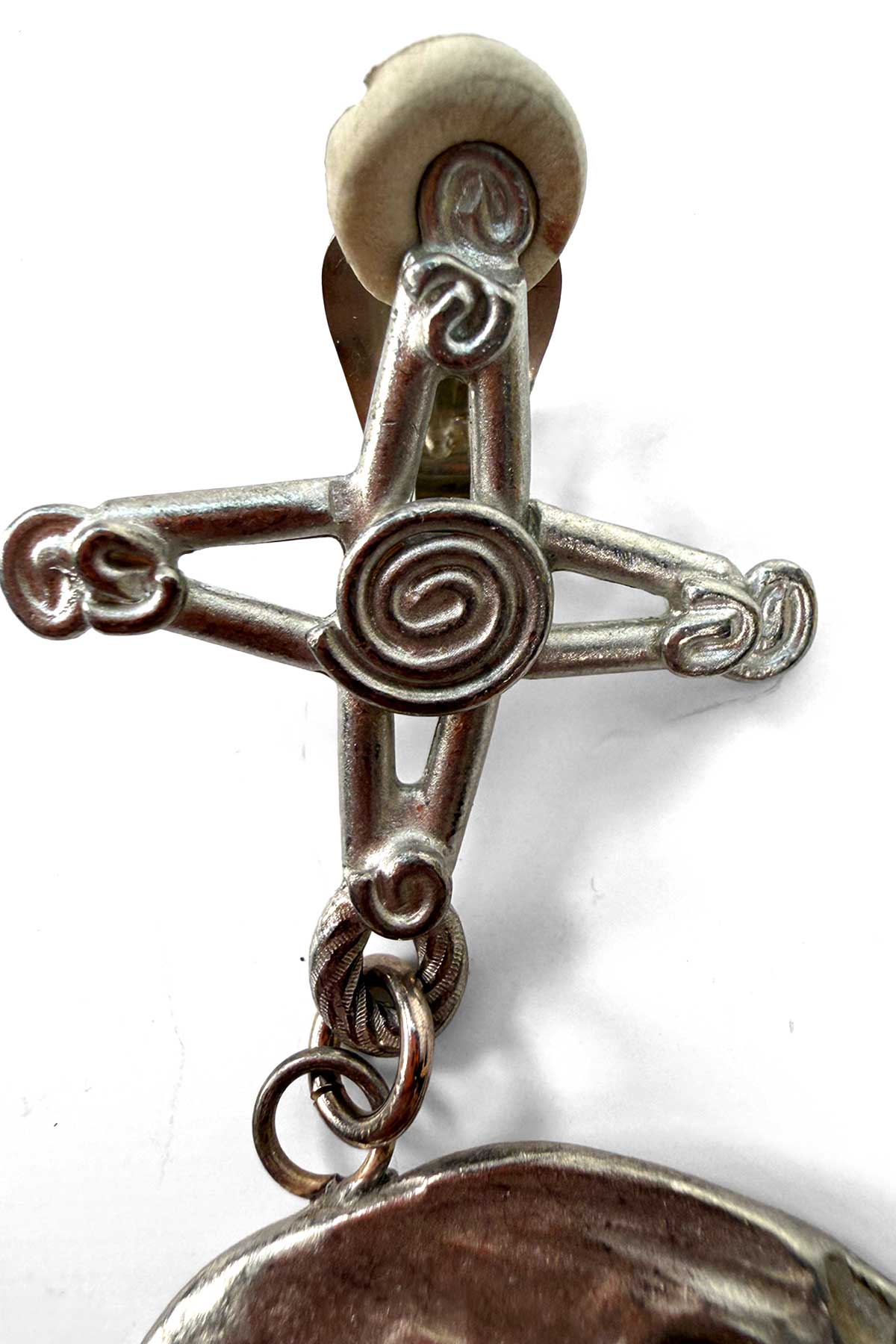 Designed by Kenny Scharf for the Todd Oldham Collection, Spring 1994. Hand-cast white metal with an oxidized finish. Clip-on style. A playful, graphic collaboration that channels Scharf’s signature style.
