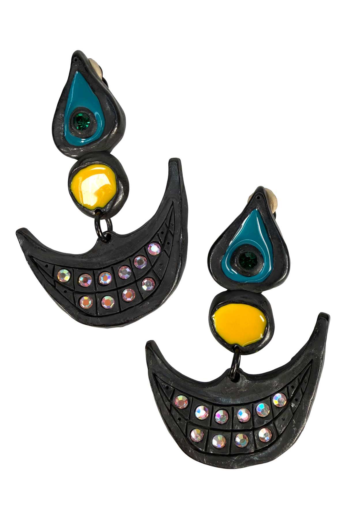 These earrings were hand-cast in white metal and finished in 24 kt gold plating, then ebonized to a rich black for dramatic contrast. Accents of lacquer and Swarovski crystals (as cute braces) add depth, color, and a little bit of sparkle!
