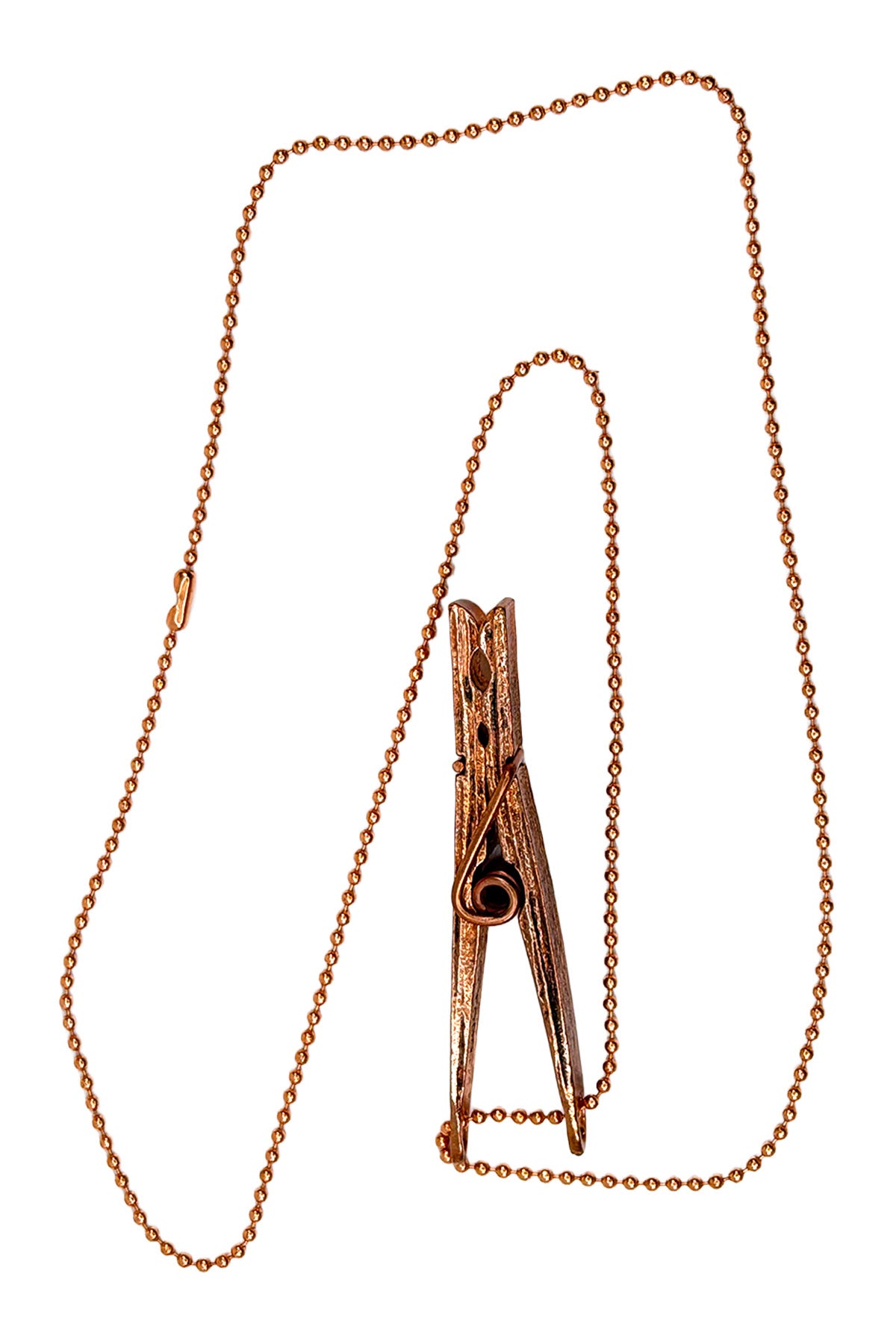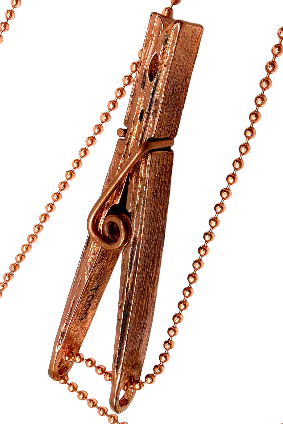 This sculptural necklace features a classic wooden clothespin fully copper plated, preserving its familiar form while transforming it into something unexpectedly refined.