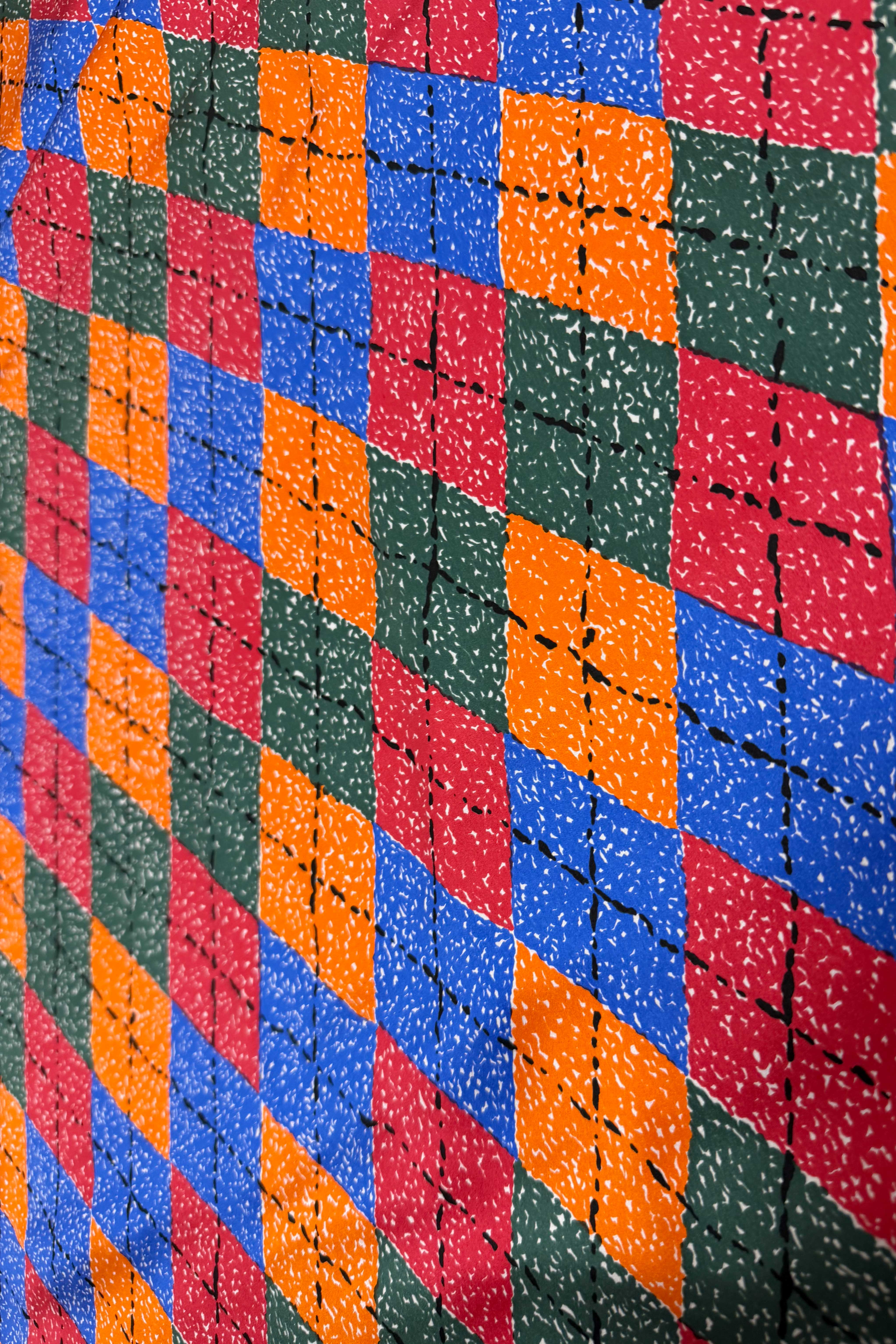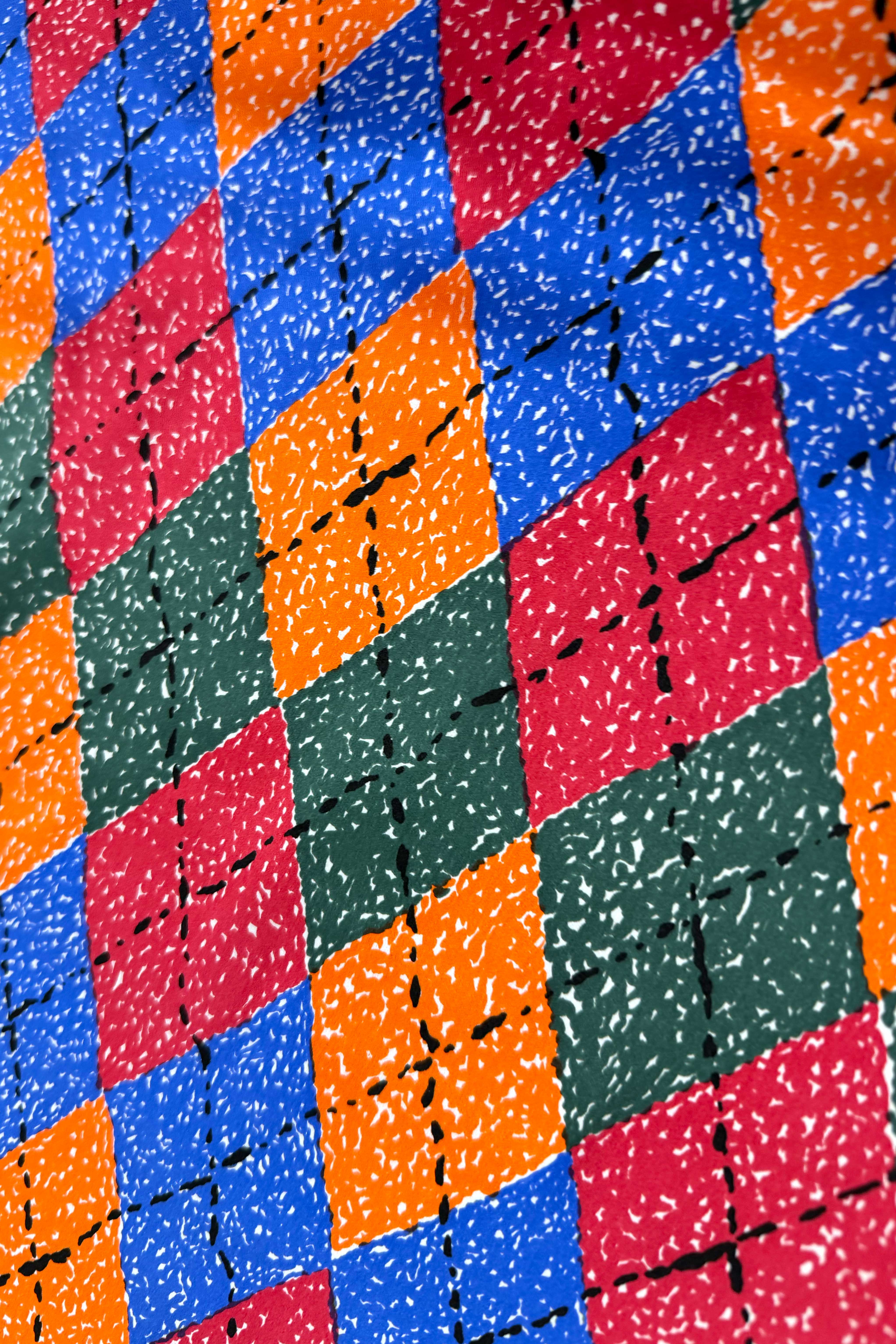 A playful “doodle” take on argyle, from the Daniella Boone Collection Fall 1994, which was a romantic riff on Daniel Boone and childhood stories of frontier adventure, raccoon-tail hats, and the mystique of the wilderness.