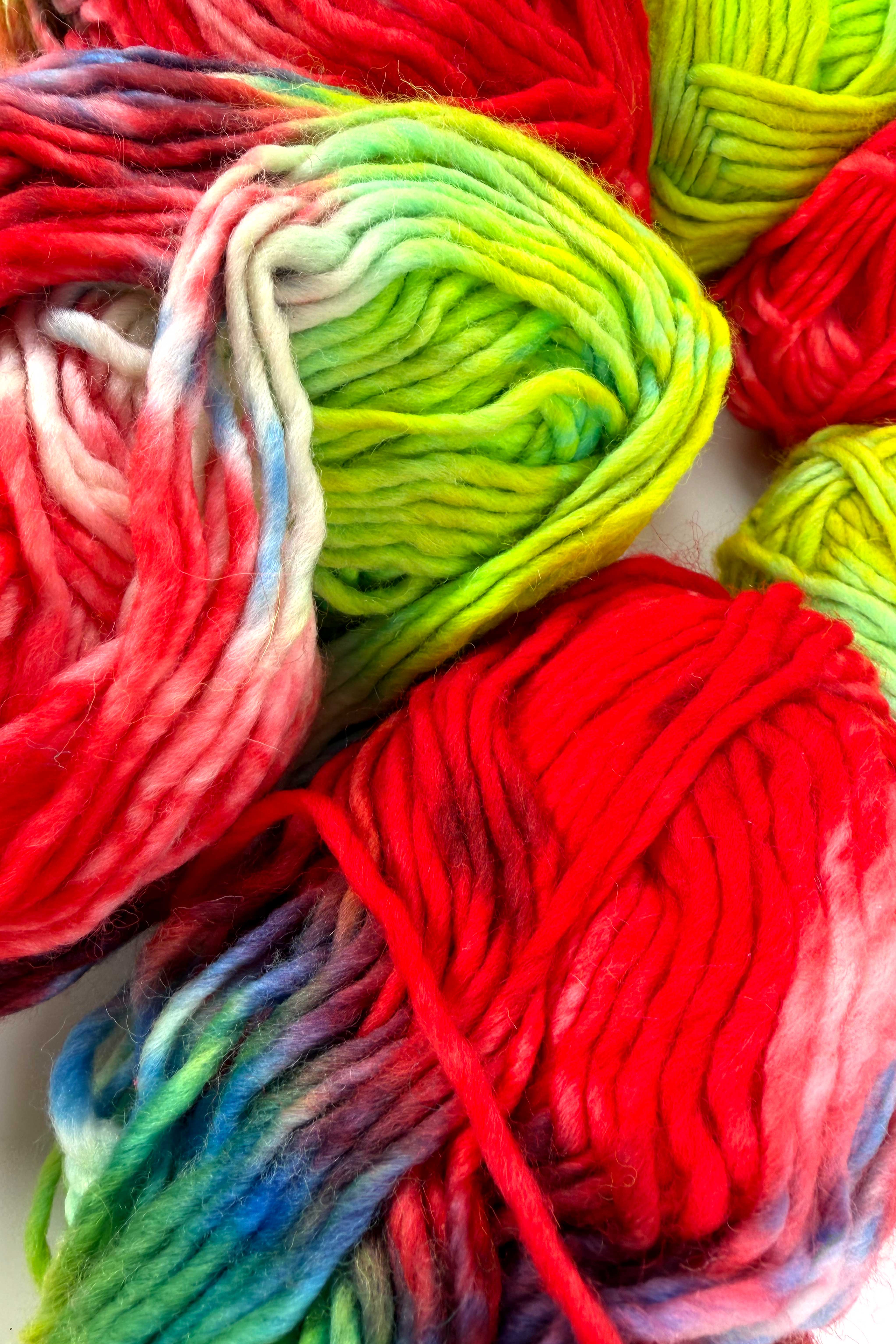A selection of six skein-dyed wool yarn, including 100% wool roving yarn, dyed as full skeins rather than in continuous lengths. This process creates a beautifully irregular, space-dyed effect with delightfully varied and inconsistent color throughout each piece. Soft, expressive, and rich in tonal shifts, these yarns are ideal for knitting, weaving, studio experimentation, or display.