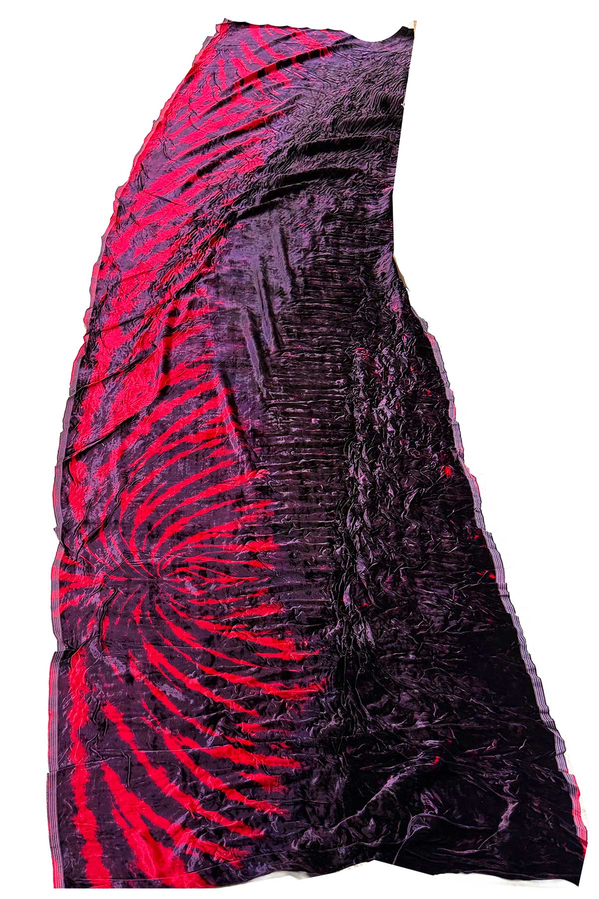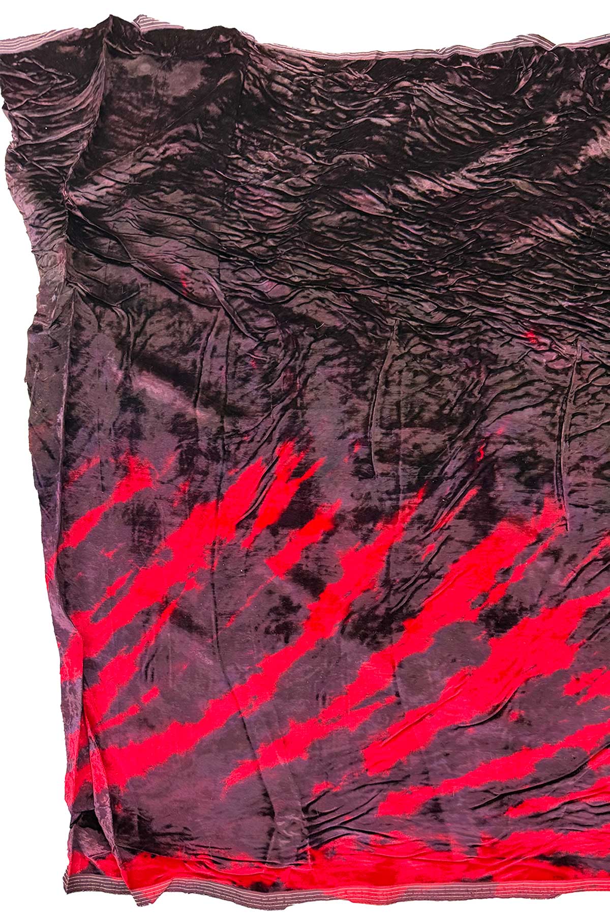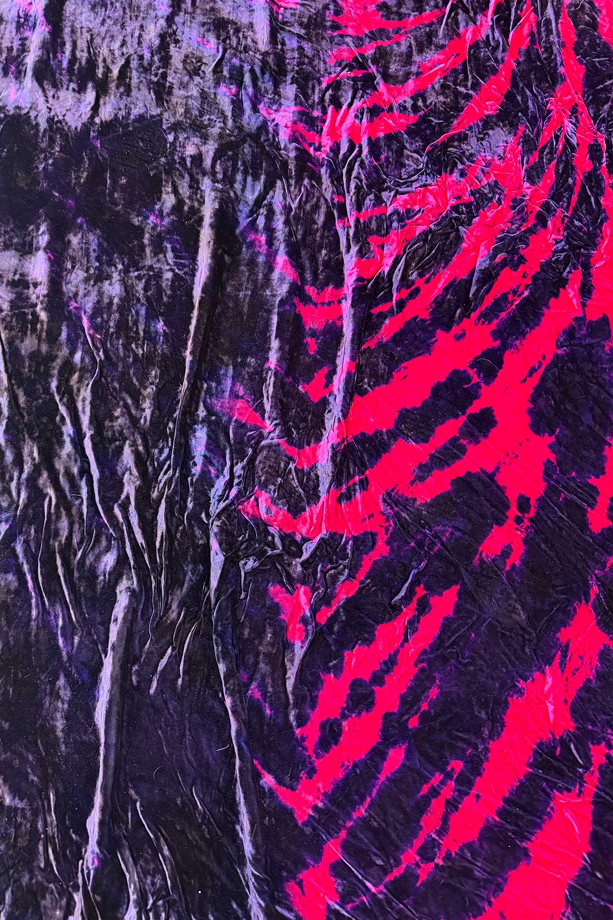 Created for the Todd Oldham Fall 1995 Collection, this hand-dyed rayon crushed velvet explores a bold zebra-inspired stripe. The surface catches light with rich dimension, shifting between depth and shimmer as it moves.