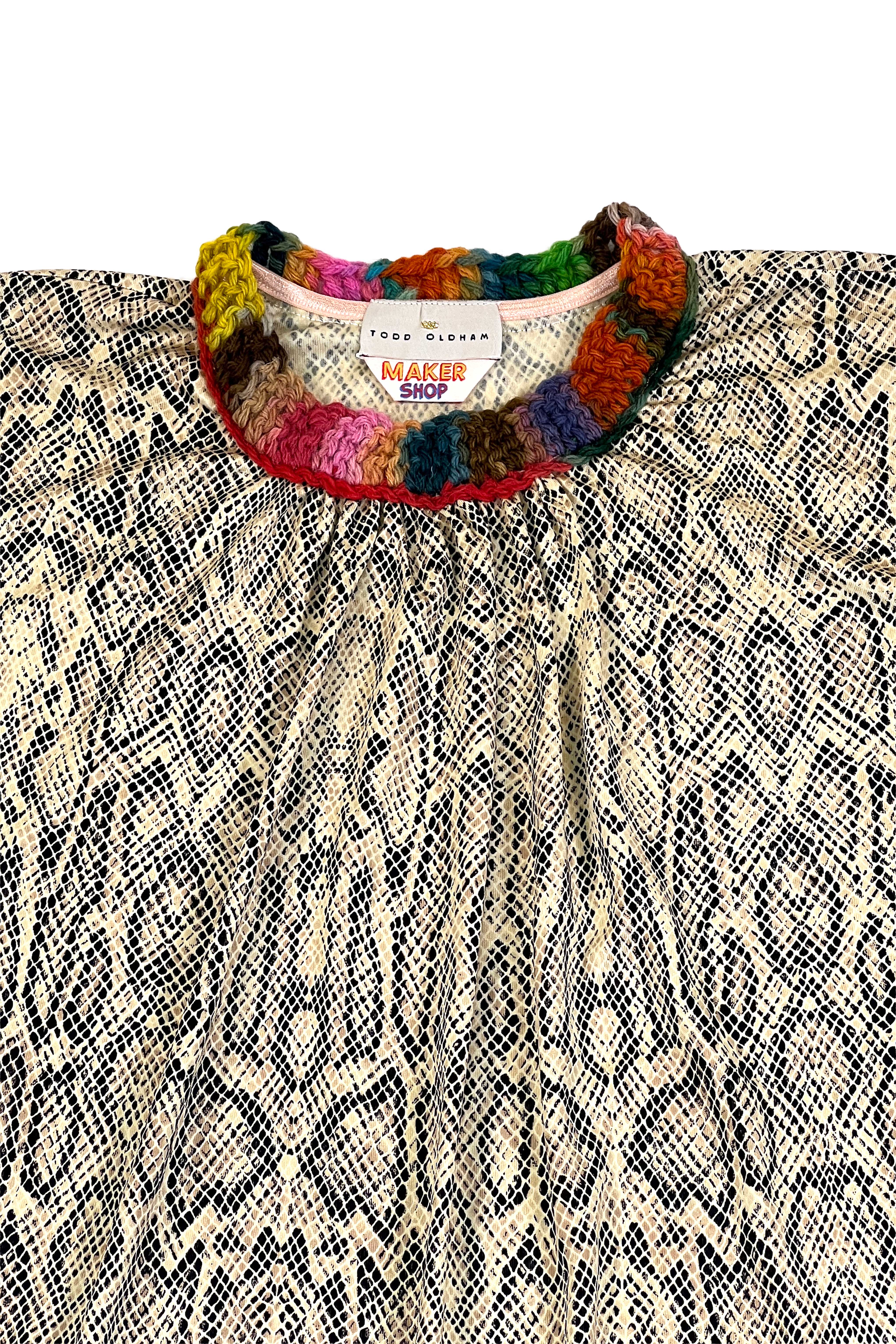 This loose-fit short sleeve dress in silky matte jersey, finished with a hand-crocheted collar and sleeve cuffs. Made from a vintage T.O. Collection textile, it drapes beautifully with an easy, comfortable feel and subtle sheen. The crochet detailing adds a thoughtful, heirloom touch—softening the silhouette and giving it that one-of-a-kind, vintage character. Effortless to throw on and style up or down, it’s the kind of piece that quickly becomes your favorite everyday dress.