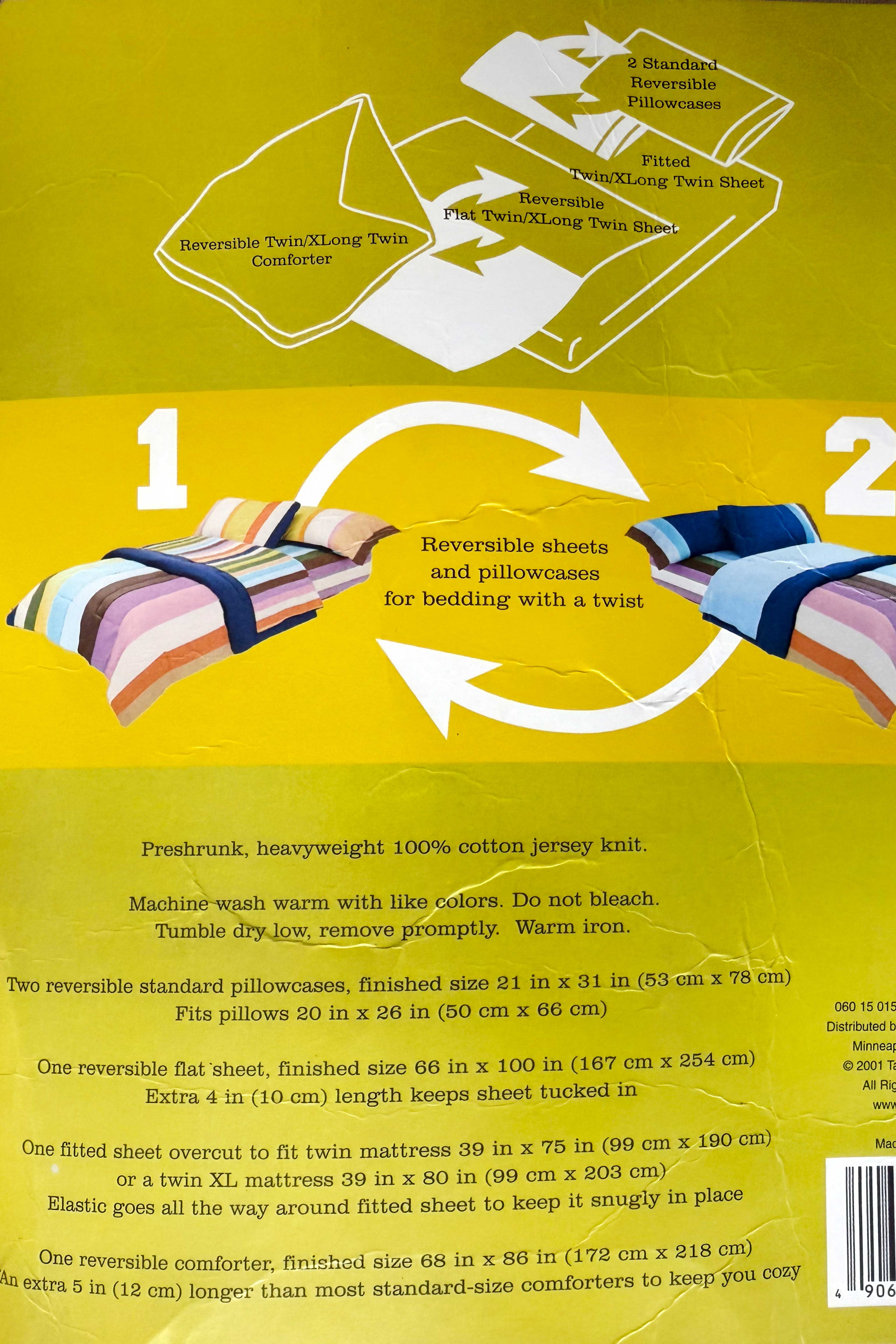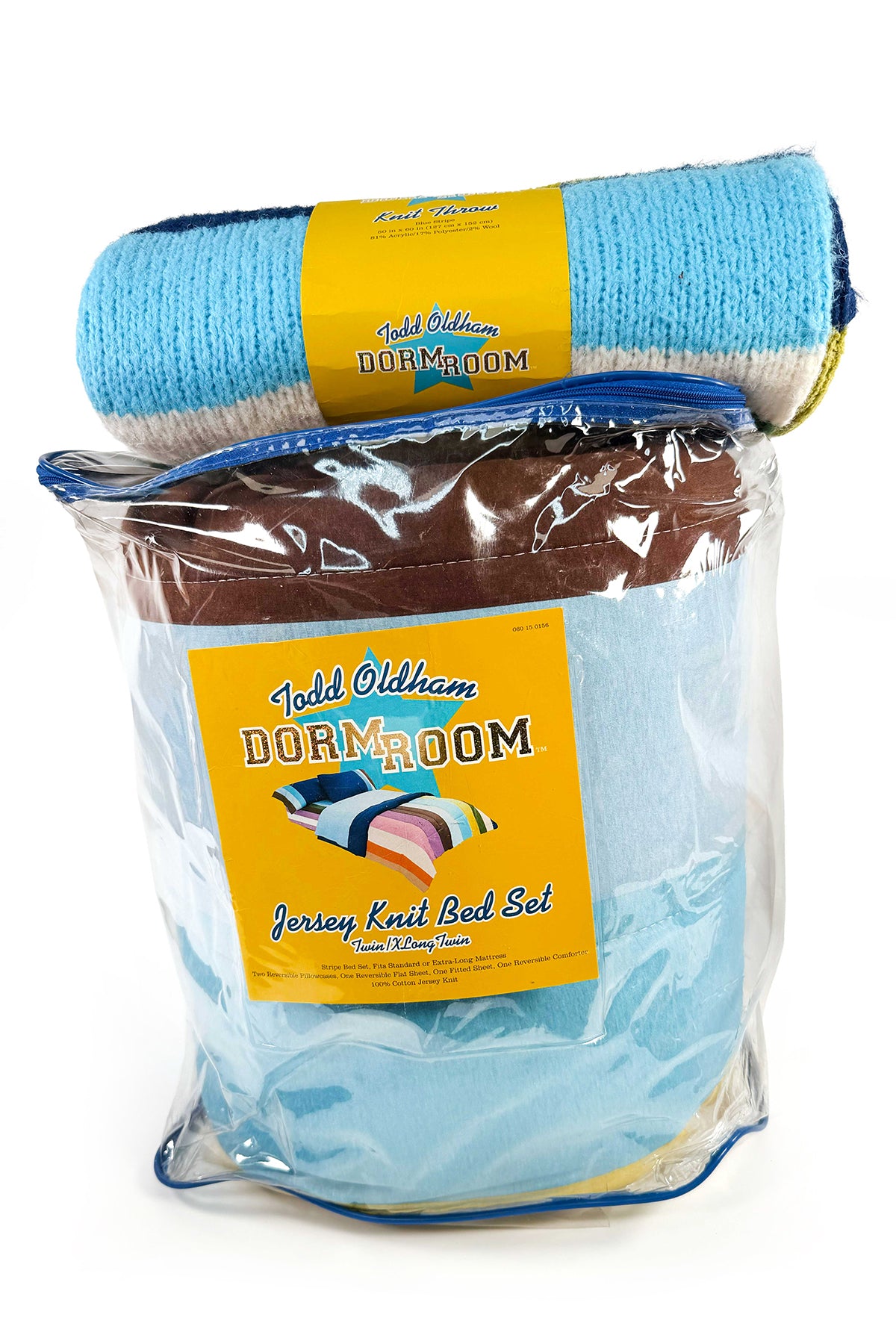 A set consisting of a knit throw and a striped twin cotton knit bed set from the Todd Oldham Dorm Room Collection, 2002. The bedspread includes a clever reversible sheet design, printed solid on one end and striped on the other, allowing students to flip it and disguise whether the bed had been freshly changed. Both pieces are unopened and brand new. See product images for exact dimensions, fabric content and care instructions.