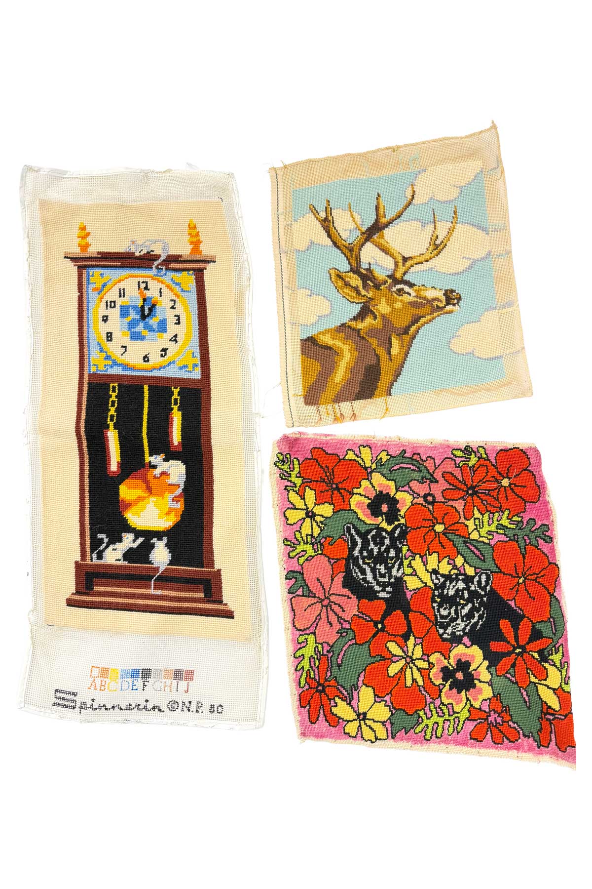 Set of three vintage needlepoint panels featuring colorful imagery.