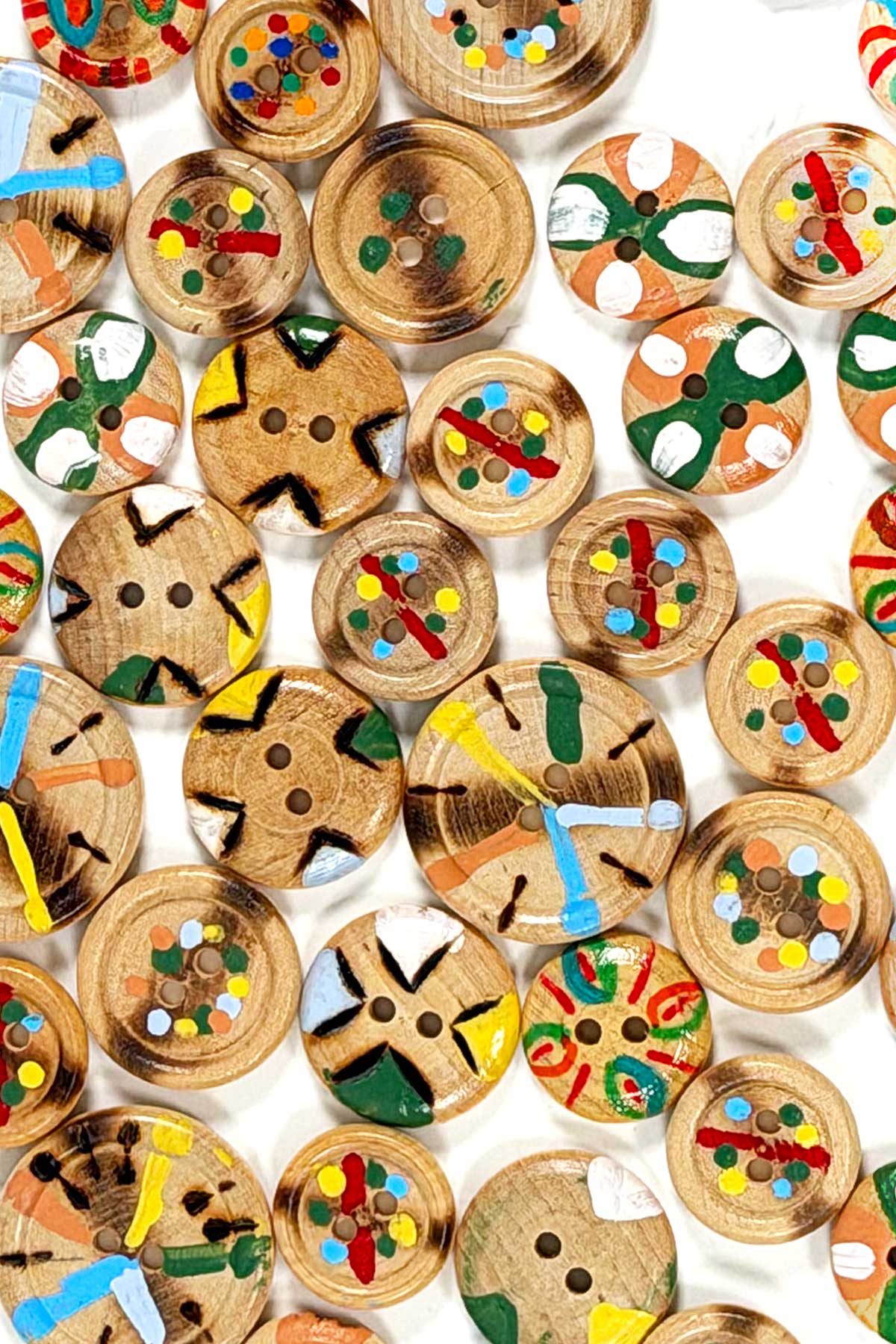 Assorted hand-painted wooden buttons made for Spring 1992. Each button features its own graphic motif and painterly detail.